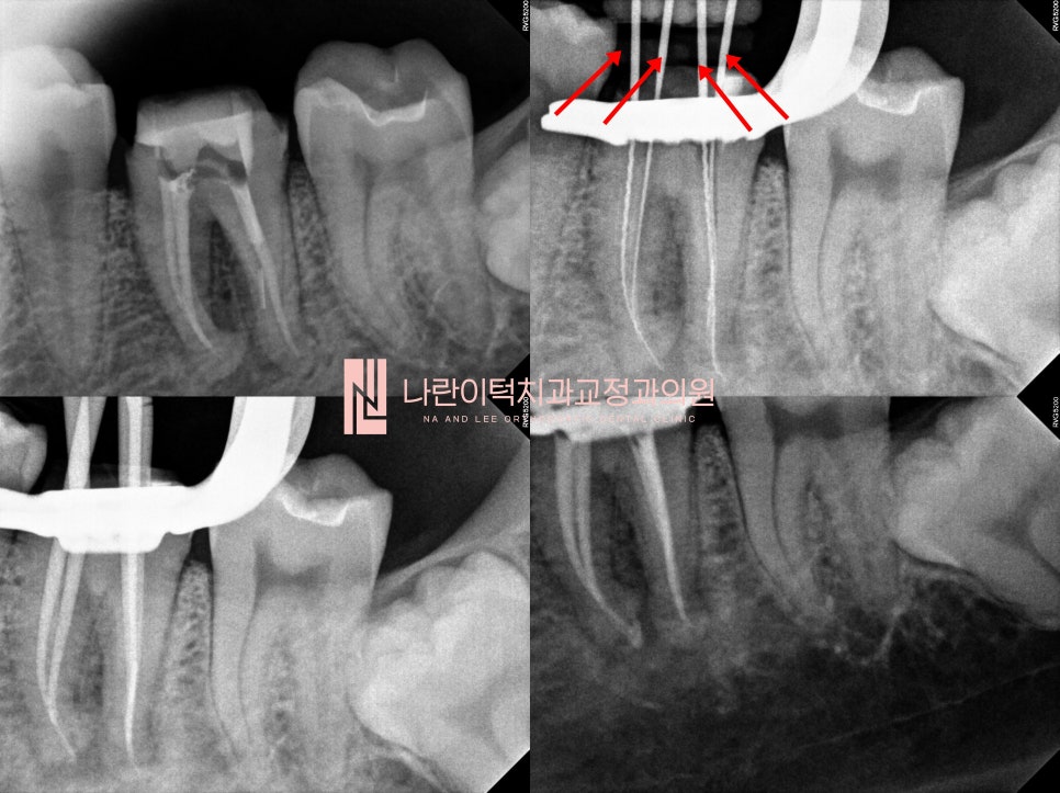 총 4개의 재신경치료가 진행되었습니다. (빨간화살표)를 통해 4개의 신경치료기구가 잘 들어간 것을 확인할 수 있습니다.