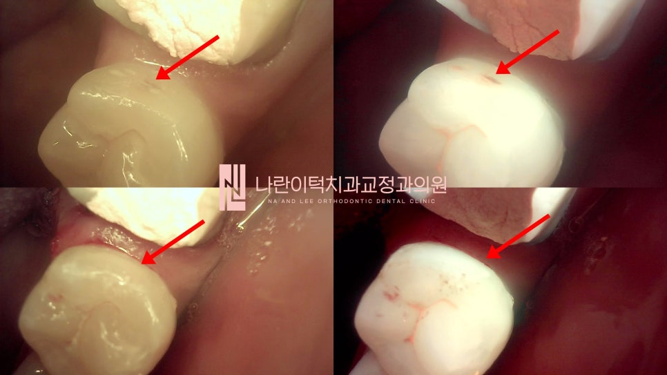 (빨간화살표) 큐레이로 촬영하여 명확하게 충치인지 확인하고 환자분과 의사소통하는 나란이턱치과입니다.