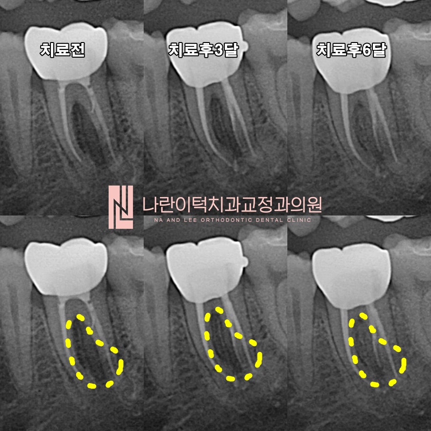 뿌리끝 염증(엑스레이상 검은 음영, 노란점선)이 점점 더 좋아지는지는 추가적인 추적관찰이 필요합니다.